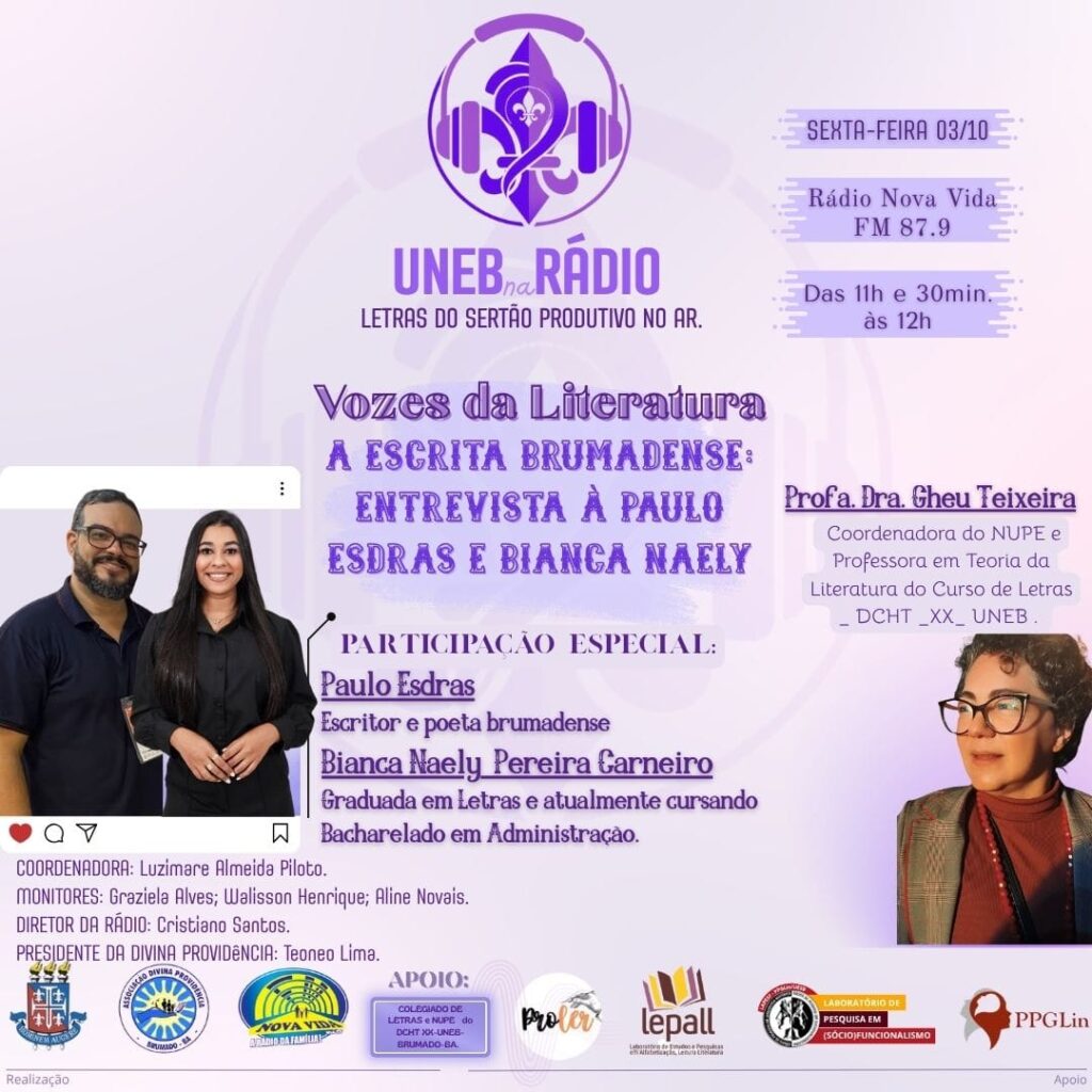 O Escritor Paulo Esdras foi entrevistado na Rádio Nova Vida 87,9 FM, no programa UNEB na Rádio, da Universidade Estadual da Bahia – Campus XX, na manhã de sexta-feira (03 de outubro de 2025), às 11h30, no quadro Vozes da Literatura, juntamente com a professora Gheu Teixeira e com Bianca Naely Pereira Carneiro, graduada em […]
