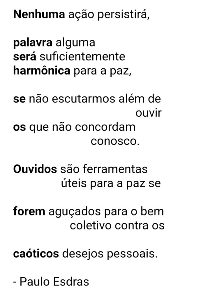 1. Tancredo Neves já dizia: “Deus me deu dois ouvidos e uma boca, para ouvir mais e falar menos”. Poesia linda e profunda, Paulo. Parabéns!